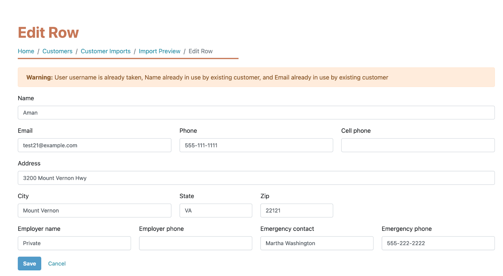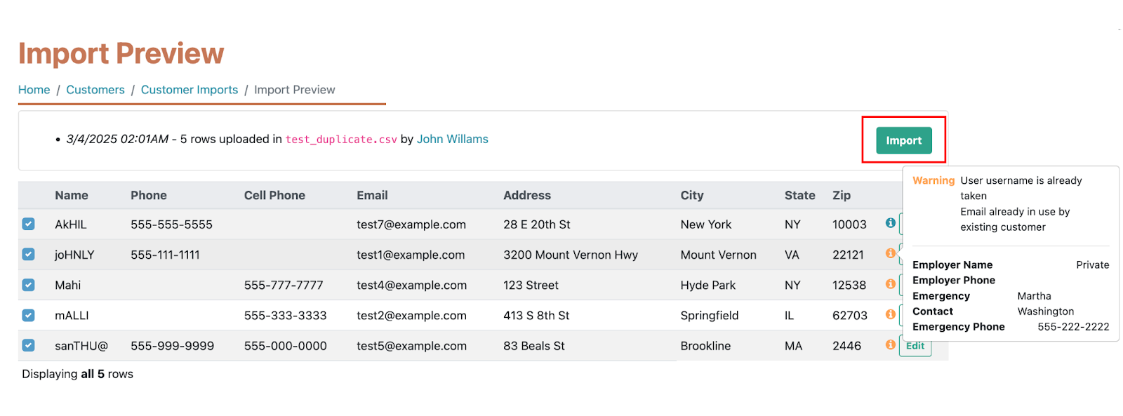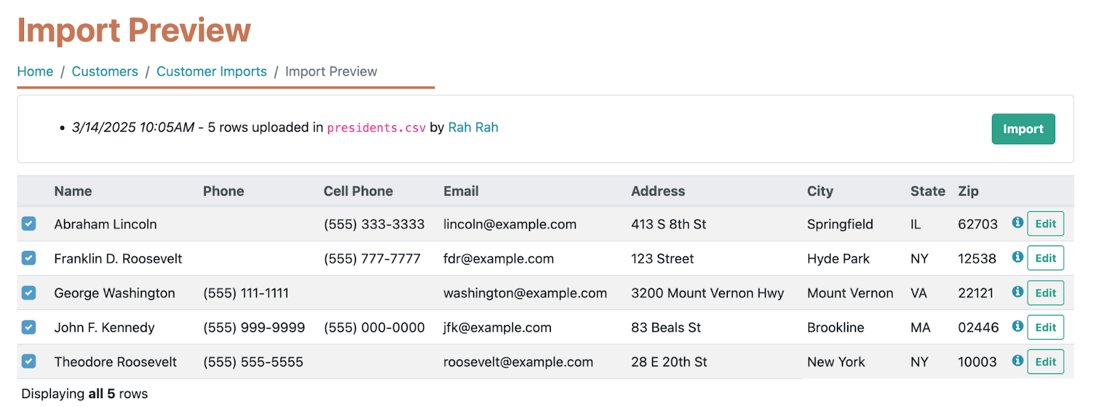 If you want to skip any customers, uncheck the box next to their names. If you need to correct data, click Edit next to the customer. Edit the data on the next screen, then click Save.