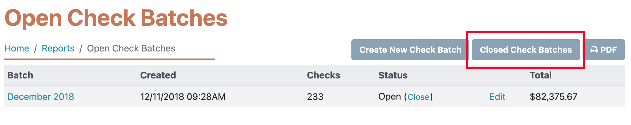 2. The batch will disappear from the main page. If you need to access it again (or any past check batches), click the Closed Check Batches button in the top right of the page.