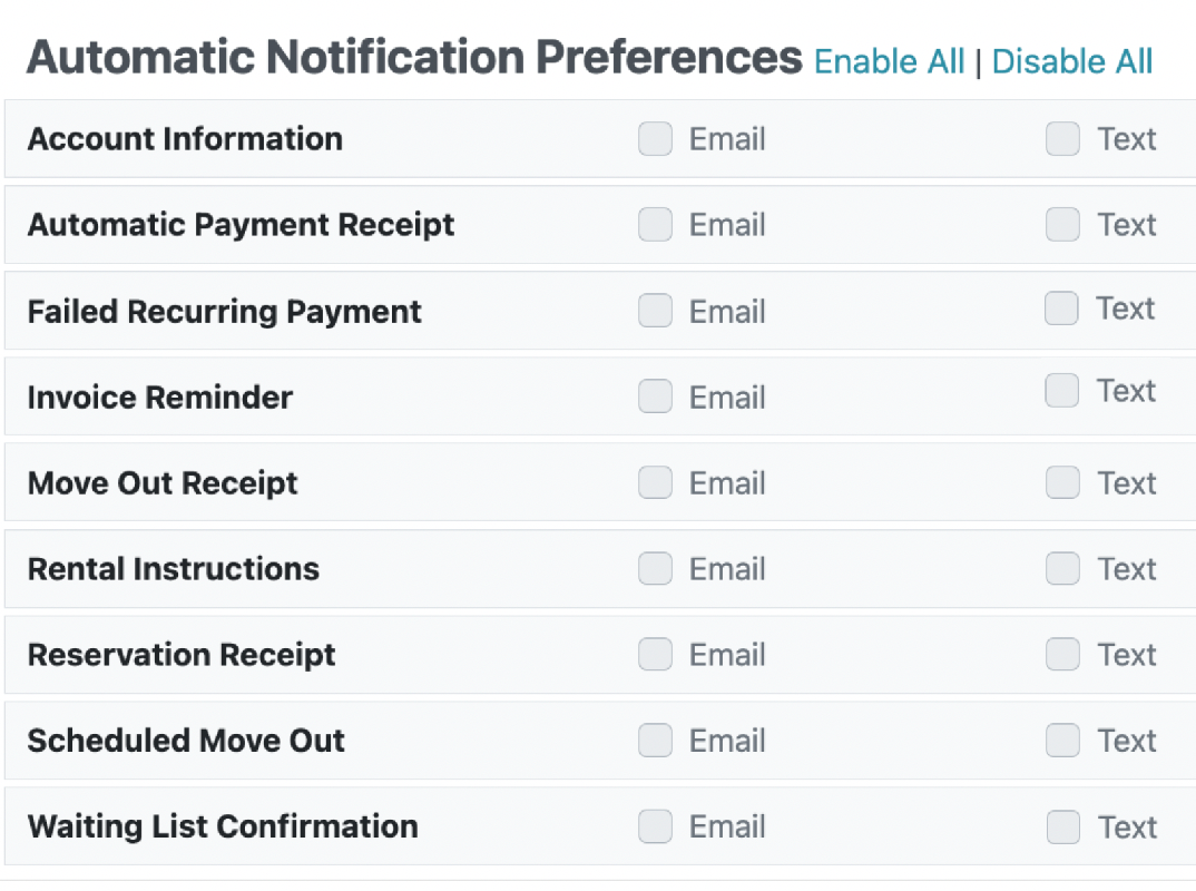 You will not be able to select Text for Automatic Notification Preferences if a tenant has not provided consent to be texted.