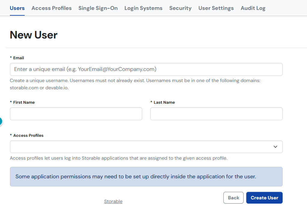 When SSO is enabled, users will be added and edited in the SSO portal. You can access the portal from your software by clicking the Storable Account Portal link from Users & Roles or logging in to the SSO Portal directly and clicking Settings.