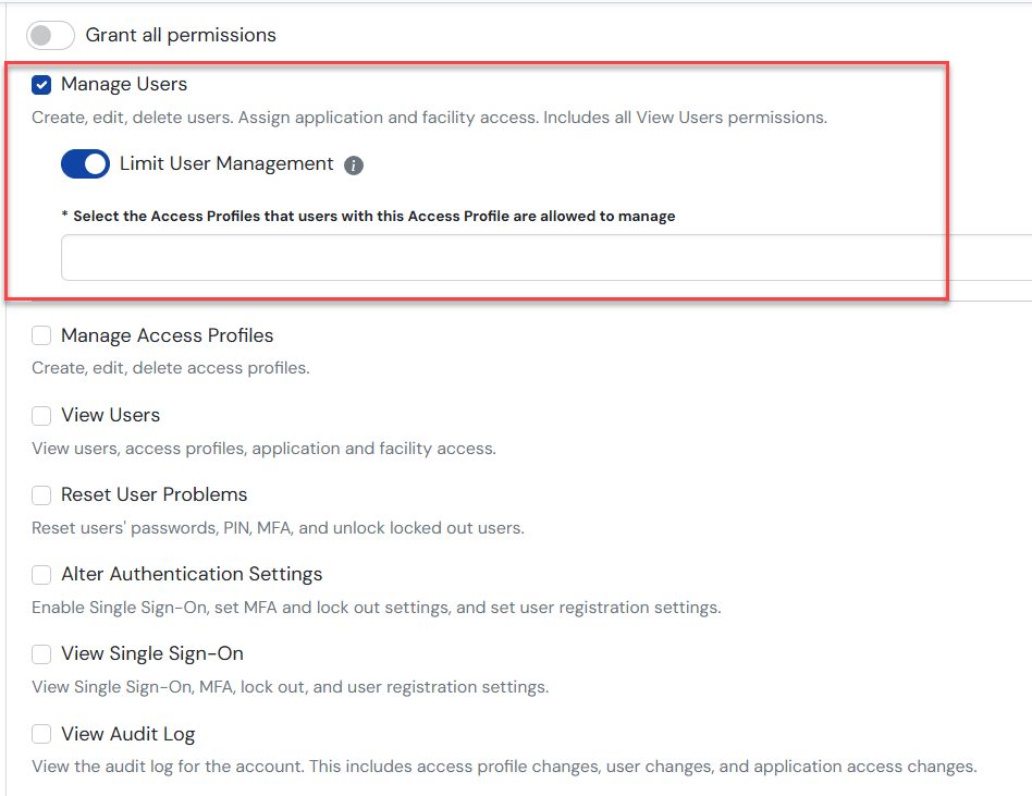 Note: You can limit user management by checking the Manage Users box and activating the Limit User Management option. When this is enabled, assigned users can only edit users with the assigned Access Profiles chosen in the dropdown menu, and can only assign those profiles when creating new users.