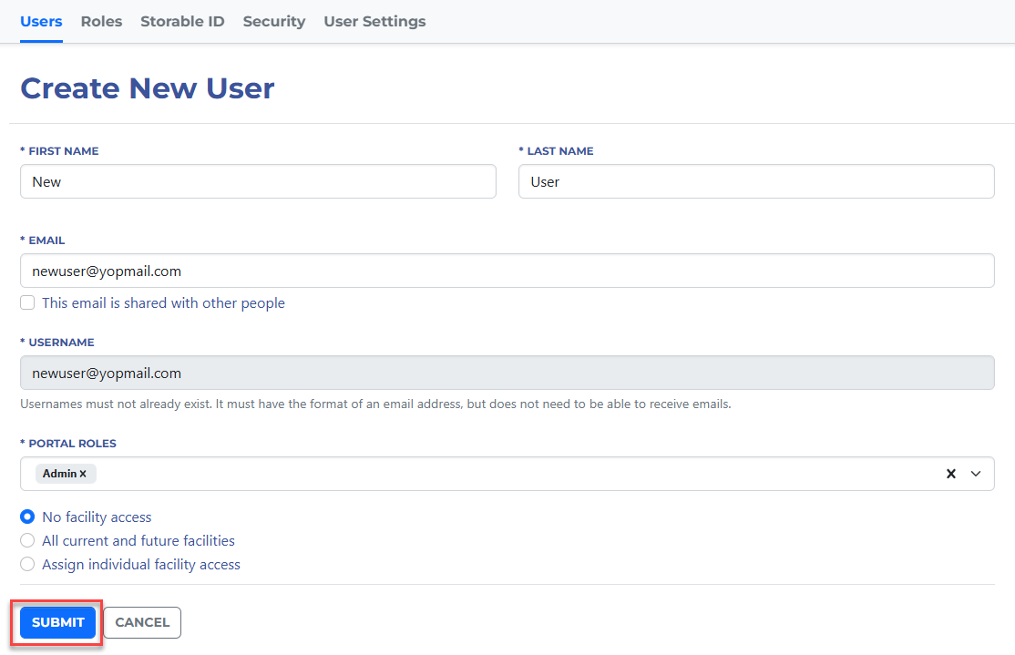 The Storable ID portal includes a Users tab, where you can add new users and change existing user access, permissions, and roles.