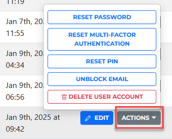 These actions are also available on the main User screen. Click the Actions button next to the user to view these options.