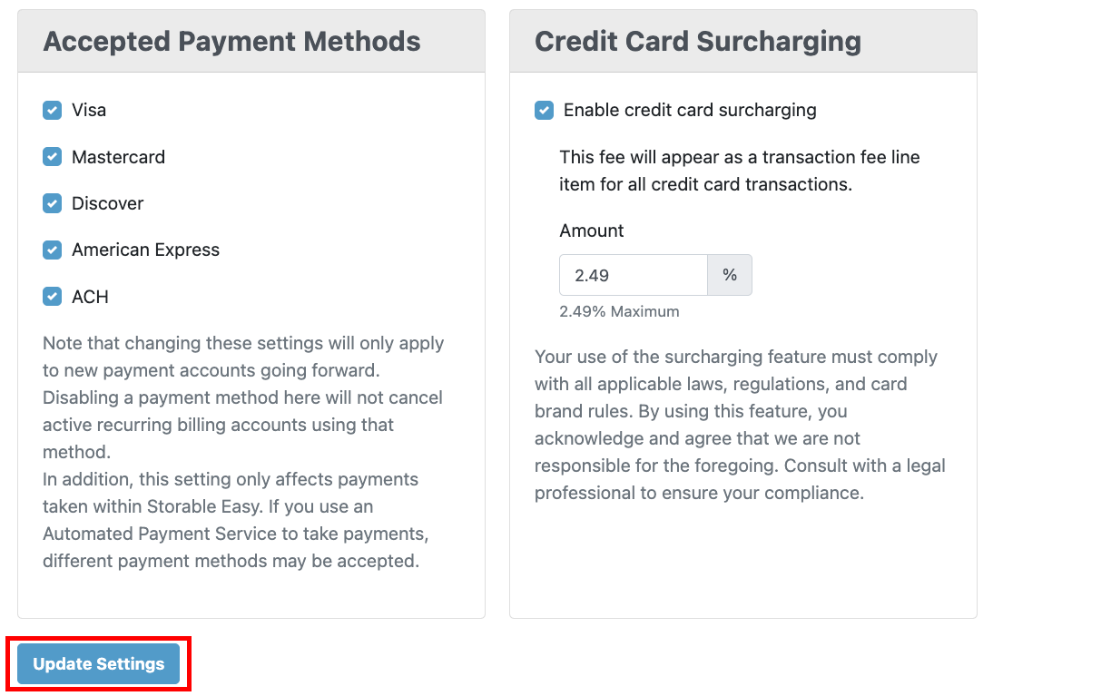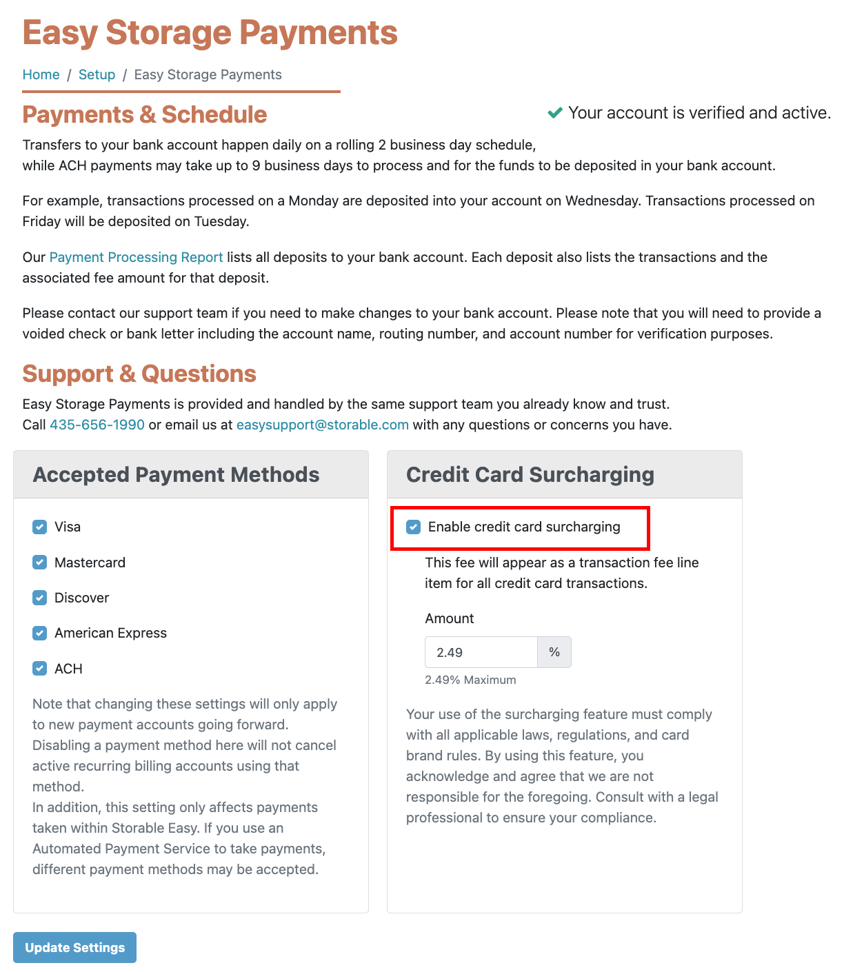 If you use Storable Payments, you have the option to add a surcharge fee to credit card payments. Surcharging allows you to charge tenants a percentage-based fee on the total transaction amount when processing electronic payments, thereby offsetting costs associated with payment processing and credit card fees.