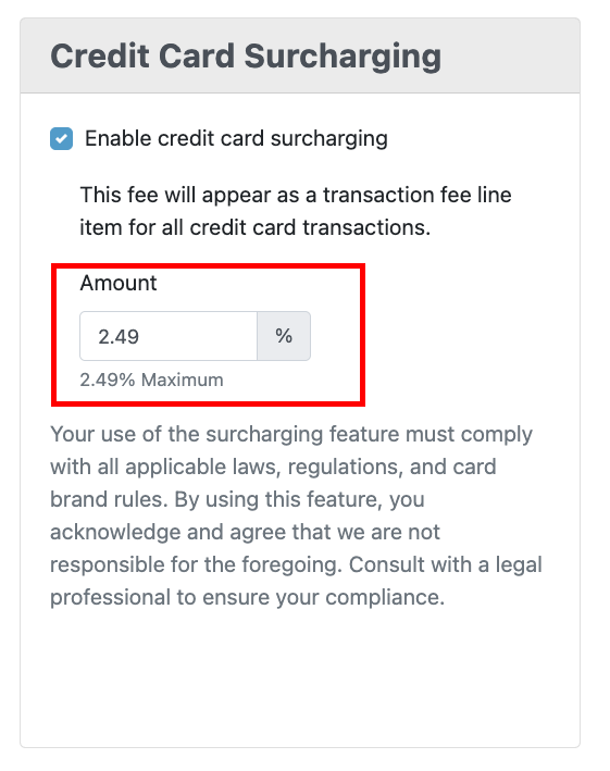 ⚠️ Read our FAQ for best practices, compliance tips, and answers to common FAQs before enabling surcharging. Your use of the surcharging feature must comply with all applicable laws, regulations, and card brand rules. By using this feature, you acknowledge and agree that we are not responsible for the foregoing. Consult with a legal professional to ensure your compliance.