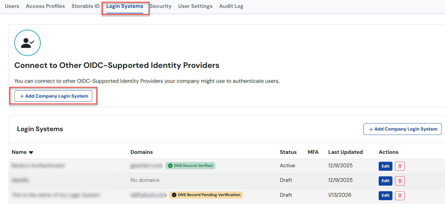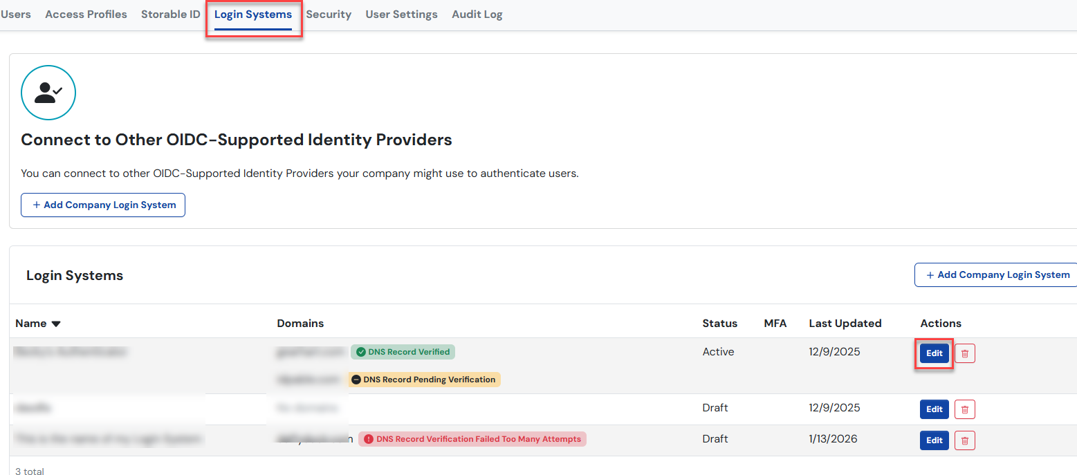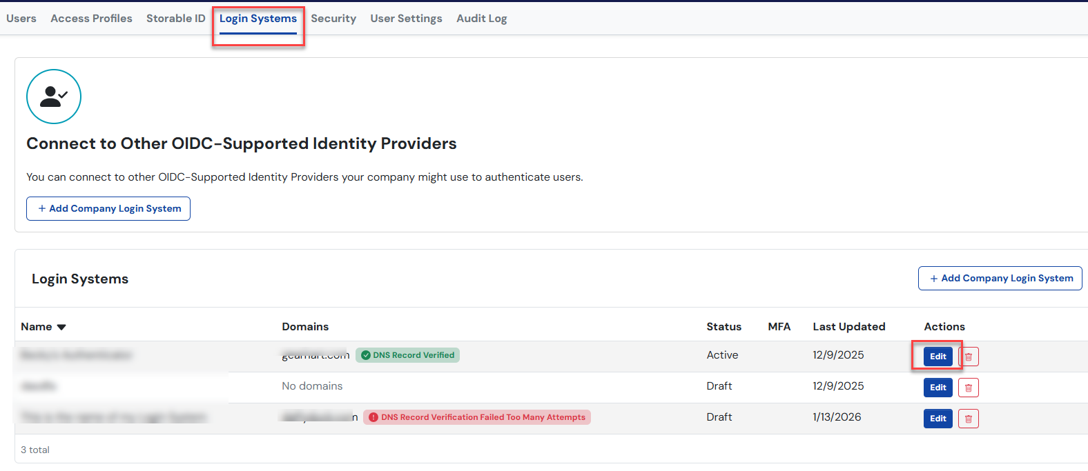 Click the Login Systems tab to review your current login systems. Any recently configured login system will display a DNS Record Pending Verification tag in yellow. Click Edit in the Actions column to proceed.