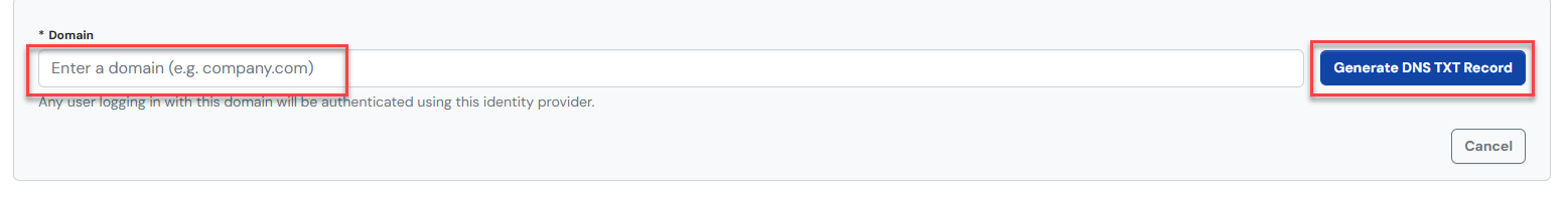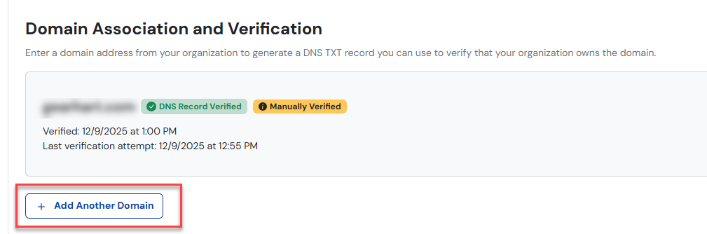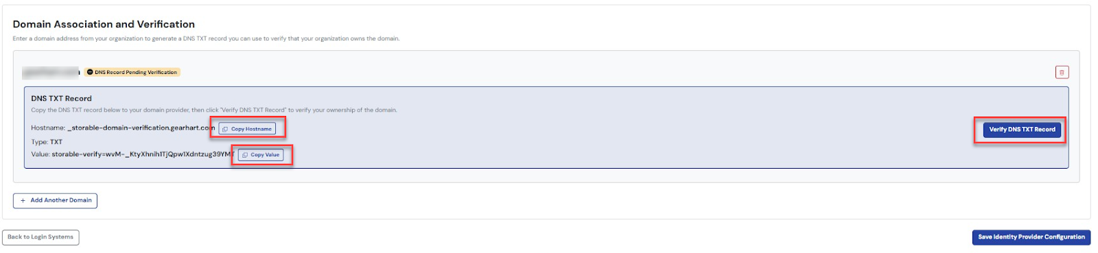 In the Domain Association and Verification section, copy the Hostname and Value, and enter this information into your domain provider. Click Verify DNS Text Record. The system checks your domain’s DNS to ensure the record is present and matches the expected value. Once verified, the company login is activated for that domain.