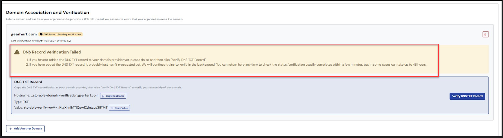 If you added the DNS text record, you may see a DNS Record Verification Failed message. Most likely, the verification hasn’t processed yet. Return to the Domain Association and Verification section at any time to check on the status. Most domain verifications take a few minutes, but can take up to 48 hours.