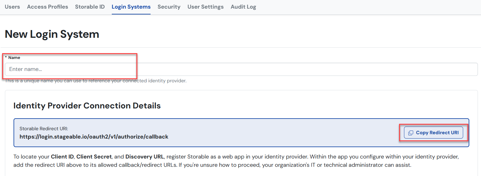 Enter a unique name to reference your unique identity provider. In your identity provider system (outside of Storable), you’ll need to register Storable as a web app. In the app you configure within your identity provider, add the redirect URI to the allowed callback/redirect URLs. Click Copy Redirect URI to copy this information, and paste into your identity provider’s app.