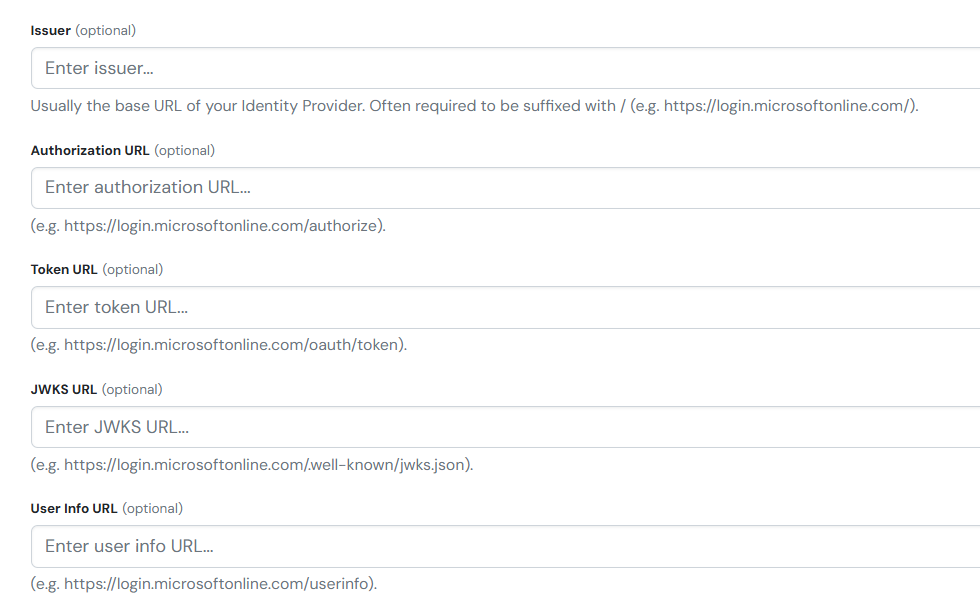 If you don’t have a Discovery URL, click I don’t have a Discovery URL and enter the information for Issuer, Authorization URL, Token URL, JKWS URL, and User Info URL.