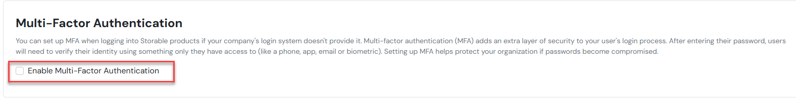 If your company’s login system doesn’t provide Multi-Factor Authentication (MFA) and you’d like to add it, check the box next to Enable Multi-Factor Authentication