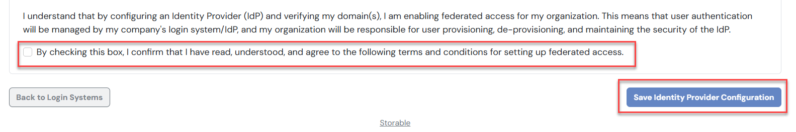 Once your information is entered, check the disclaimer box and click Save Identity Provider Configuration